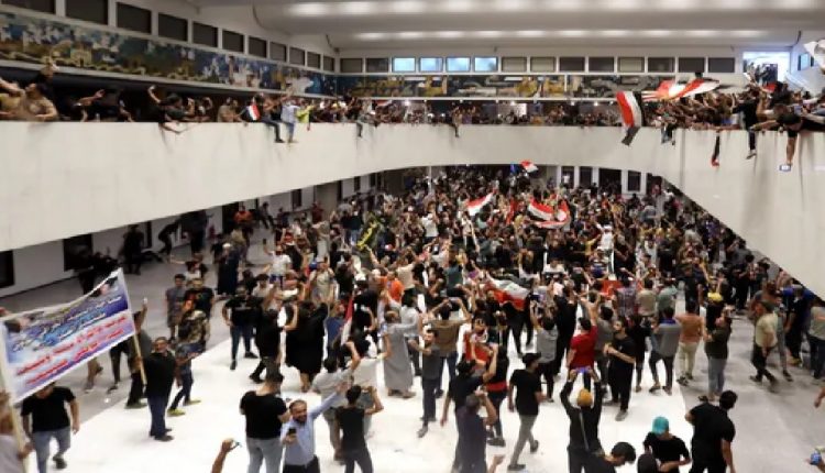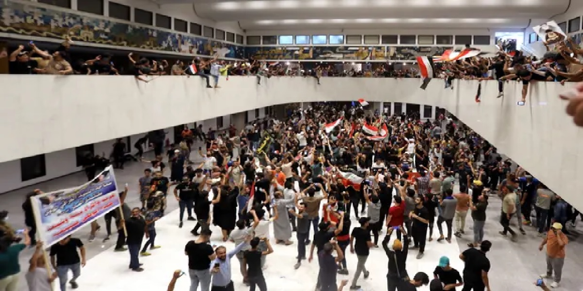 سینکڑوں مظاہرین دارالحکومت بغداد کے محفوظ ترین علاقے گرین زون کی رکاوٹوں کو توڑتے ہوئے پارلیمنٹ کی عمارت میں داخل ہو گئے تاہم اس وقت وہاں کوئی رکن موجود نہیں تھا۔ عراقی پارلیمنٹ کی عمارت سے متصل بہت اہم سیاسی اور سفارتی عمارتیں بھی واقع ہیں۔ نگراں وزیراعظم مصطفیٰ الکاظمی نے مظاہرین سے فوری طور پر وہاں سے نکل جانے کو کہا۔