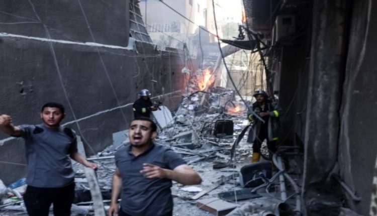 اسرائیلی طیاروں کی وحشیانہ بمباری کے بعد غزہ شہر میں فلسطین ٹاور کی ساتویں منزل سے دھواں نکلا۔ شہری دفاع کی ٹیمیں جائے وقوعہ پر پہنچ گئیں تاکہ لوگوں کو نکالا جائے اور حملے سے لگنے والی آگ پر قابو پالیا جائے۔