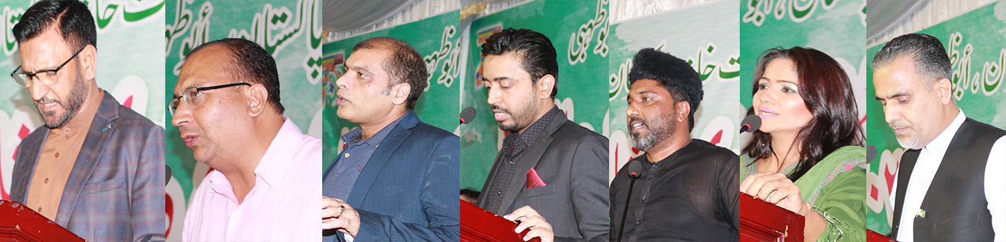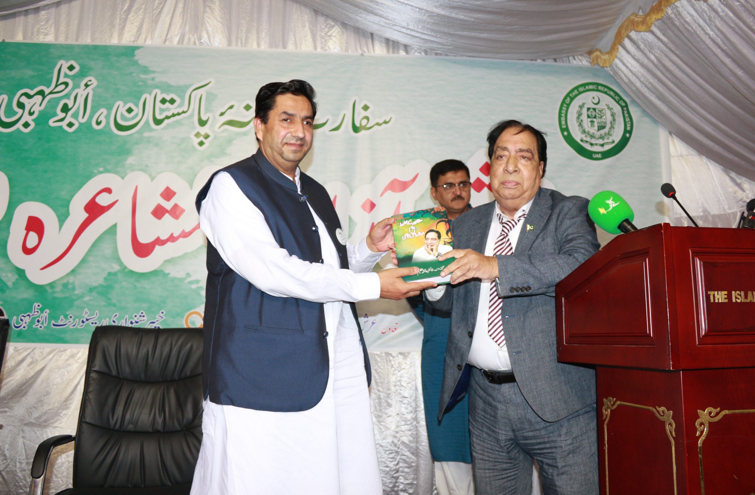 ابوظہبی(اردوویکلی):: پاکستان کی ڈائمنڈ جوبلی کی مناسبت سے سفارت خانہ پاکستان ابوظہبی میں "جشن آزادی مشاعرہ2022 "کے عنوان سے ایک خوبصورت مشاعرہ تقریب کاانعقاد کیاگیا،تقریب کے مہمان خصوصی قونصل جنرل پاکستان حسن افضل خان تھے جبکہ محفل مشاعرہ کی صدارت معروف شاعر، مصنف و کالم نگار عطاء الحق قاسمی نے کی۔تقریب کے میزبان ناظم الامور سفارتخانہ پاکستان امتیاز فیروز گوندل تھےجبکہ معروف شعراء میں ظہورالاسلام جاوید،عباس تابش،یعقوب تصور،،گلِ نوخیزاختر،عزیراحمد،ثاقب تبسم ثاقب،شہاب الدین شہاب،سلمان احمدخان،ظہیرمشتاق،عائشہ شیخ عاشی،سیدتابش زیدی،کنول ملک،حفیظ عامر،ابرارعمر،فریدانوارصدیقی،رضااحمدرضا،چوہدری مسرت عباس، مرزامعیداحمد،شیخ طاہروسیم، اوررفاقت اللہ شامل تھے مشاعرہ تقریب میں پاکستانی کمیونٹی کی بڑی تعداد نے شرکت کی ۔تقریب کی نظامت معروف شاعر ووائس پرنسپل اسلامیہ انگلش سکول سلمان احمدخان نے بحسن وخوبی انجام دیئے۔مشاعرے کی پروقارتقریب کی ابتدا رب کائنات کے بابرکت نام سے کی گئی۔