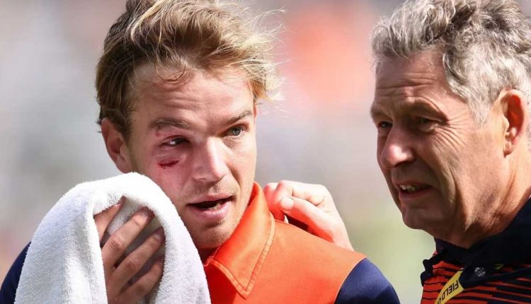 تفصیلات کے مطابق فاسٹ بولر حارث رؤف اپنا پہلا اور نیدر لینڈ کی بیٹنگ کا چھٹا اوور کرانے کے لیے آئے اور اوور کی پانچویں گیند باؤنسر ماری جو سیدھی نیدر لینڈ کے بیٹر ڈی لیڈ کے ہیلمٹ پر دائیں جانب لگی۔