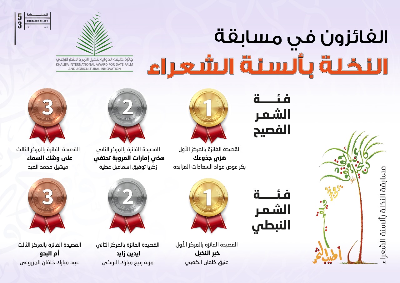 ابوظہبی(ویب ڈیسک)::خلیفہ انٹرنیشنل ایوارڈ فار ڈیٹ پام اینڈ ایگریکلچرل انوویشن جنرل سیکرٹریٹ نے اپنے 8ویں سیشن (2024) میں "ڈیٹ پام انٹرنیشنل پوئٹری” مقابلے کے فاتحین کا اعلان کیا، جو کہ وزیربرائے رواداری و بقائے باہمی ،ایوارڈ کے بورڈ آف ٹرسٹیز کے چیئرمین عزت مآب شیخ نہیان مبارک النہیان،کی سرپرستی میں منعقد ہوا۔