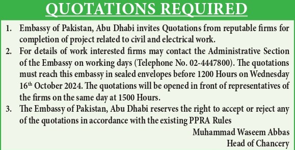سفارت خانہ پاکستان ابوظہبی کو سول والیکٹرکل ورک کی تکیمل کے لیئے یواے ای کی معروف کمپنیوں سے کوٹیشن مطلوب ہیں