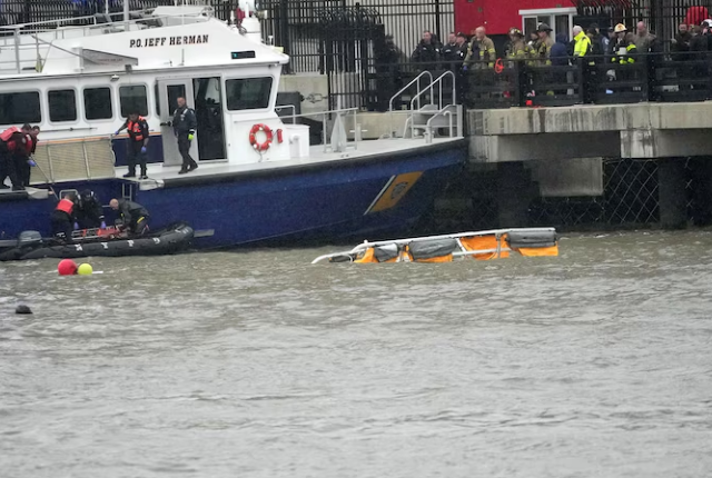 نیو یارک کے لوئر مین ہیٹن کے قریب دریائے ہڈسن پر ہڈسن پر ہیلی کاپٹر کے حادثے کے مقام پر ہنگامی اہلکار کام کرتے ہیں ، جیسا کہ نیو پورٹ ، نیو جرسی سے دیکھا گیا ہے ، 10 اپریل ، 2025 کو۔ ایڈورڈو منوز/رائٹرز