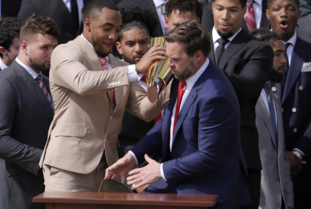 یونائیٹڈ کے نائب صدر نے بیان کیا کہ جے ڈی وینس نے پیر کو وائٹ ہاؤس کی ایک تقریب کے دوران اوہائیو اسٹیٹ کی قومی چیمپیئن شپ فٹ بال ٹرافی کا ایک حصہ غلطی سے گرا دیا ، جس سے ہجوم سے قابل سماعت ہانپیں کھینچیں اور ٹریوین ہینڈرسن کو پیچھے بھاگتے ہوئے بوکیز سے فوری اضطراب کا اشارہ کیا۔
