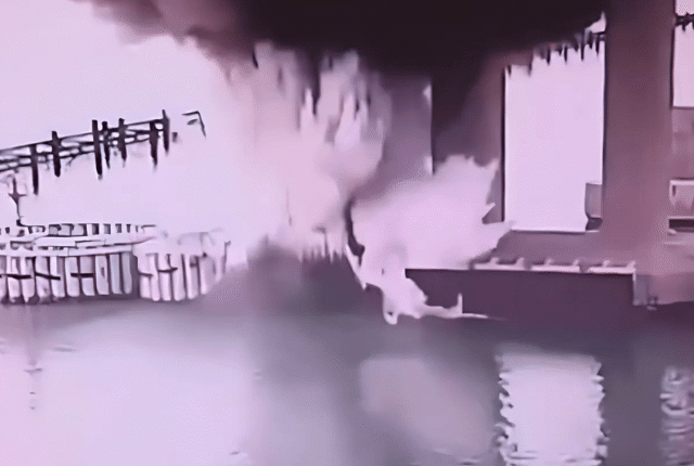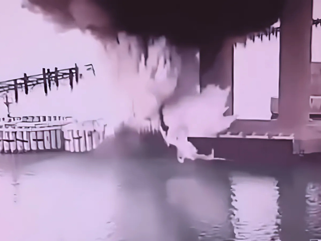 ایس بی یو کے ذریعہ جاری کردہ ویڈیو فوٹیج میں پل کے سپورٹ ستونوں میں سے ایک کے قریب ایک دھماکہ ہوا۔