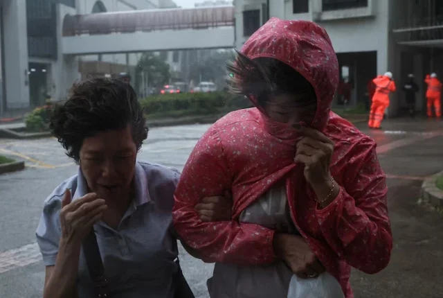 ہانگ کانگ ، چین ، 20 جولائی ، 2025 میں ٹائفون وِپھا کے قریب آتے ہی کارکن تیز ہواؤں کی تیز ہوائیں چلاتے ہیں۔ رائٹرز/ٹائرون ایس آئی یو