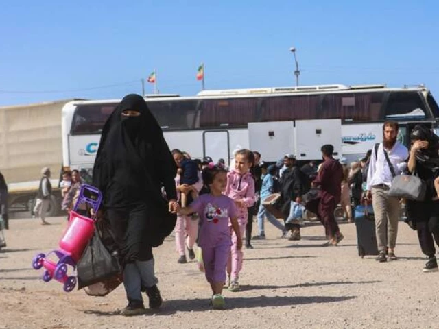 24 جولائی ، 2025 کو ہرات کے صوبے میں اسلام قلعہ بارڈر پر صفر پوائنٹ پر ایک ایرانی بس افغان مہاجرین سے گرتی ہے۔ تصویر: اے ایف پی