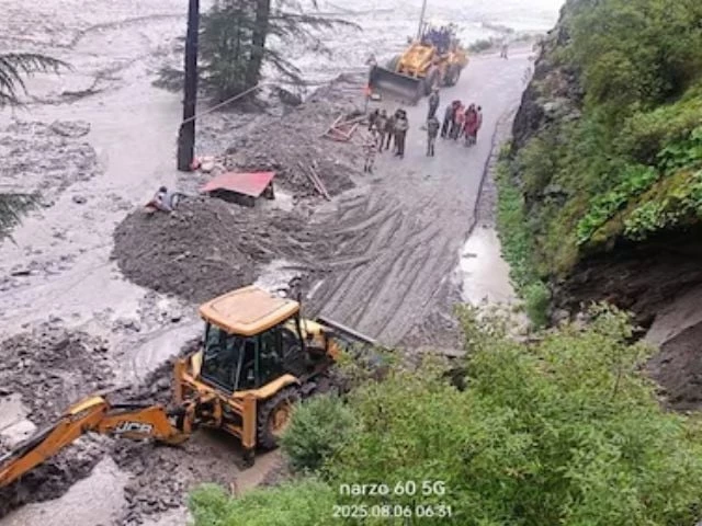 ایک کھدائی کرنے والے کا ڈرون نظارہ ، جیسا کہ یہ اترکاند ، اتراکھنڈ ، اتراکھنڈ ، ہندوستان ، 7 اگست ، 2025 کے اترکاشی ضلع میں لینڈ سلائیڈ کے بعد ایک خراب سڑک سے ملبے کو صاف کرتا ہے۔ رائٹرز