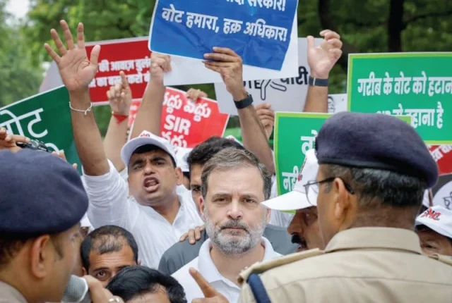 پیر کے روز نئی دہلی میں ہندوستانی حزب اختلاف کے درجنوں رہنماؤں کو حراست میں لیا گیا جب انہوں نے نعرے لگائے ، بیریکیڈس کود پائے اور انتخابی بدعنوانیوں کے خلاف ایک غیر معمولی عوامی احتجاج میں الیکشن کمیشن میں مارچ کیا۔