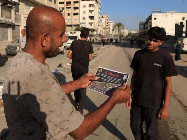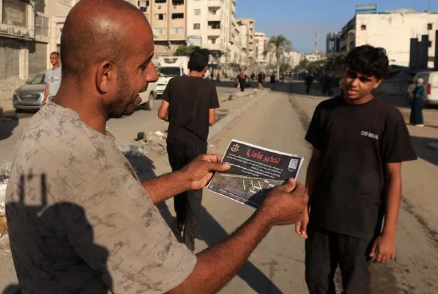 9 ستمبر 2025 میں غزہ سٹی میں ، ایک فلسطینی شخص نے اسرائیلی افواج کے ذریعہ ایک کتابچہ پکڑا ، جس کو اسرائیلی افواج نے گرایا۔
