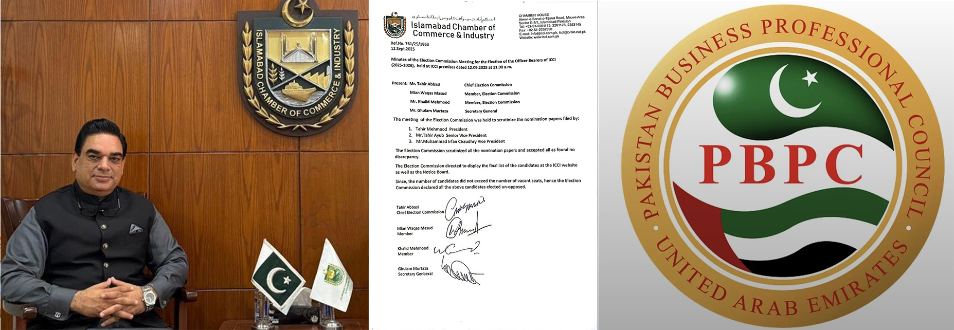 اسلام آباد چیمبر آف کامرس اینڈ انڈسٹری کے نو منتخب عہدیداران کوچیف کوآرڈینیٹرپاکستان بزنس پروفیشنل کونسل راس الخٰیمہ وفجیرہ انجینئیرمحمدجاوید کی جانب سے مبارکباد اورمستقبل میں کامیابی کے لیئے نیک خواہشات کااظہار
