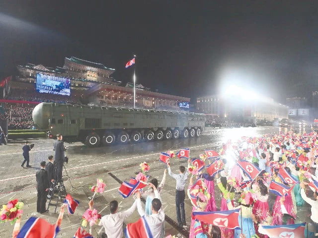 سرکاری میڈیا کے سی این اے نے ہفتے کے روز کہا کہ شمالی کوریا کے رہنما کم جونگ ان نے ایک بڑی فوجی پریڈ کی نگرانی کی ہے جس میں بین الاقوامی معززین کے سامنے اپنے نئے بین البراعظمی بیلسٹک میزائل کو ظاہر کیا گیا ہے۔