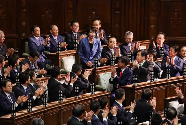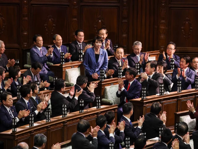 جاپان کی رولنگ لبرل ڈیموکریٹک پارٹی (ایل ڈی پی) ثانی تاکاچی نے 21 اکتوبر ، 2025 کو جاپان کے شہر ٹوکیو میں واقع پارلیمنٹ کے نچلے ہاؤس میں وزیر اعظم منتخب ہونے کے بعد تالیاں وصول کیں۔