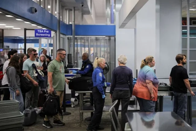 مسافر یکم اکتوبر ، 2025 میں ، برن بینک ، کیلیفورنیا میں امریکی حکومت کے جزوی طور پر بند ہونے کے پہلے دن ہالی ووڈ برن بینک ہوائی اڈے پر ٹرانسپورٹیشن سیکیورٹی ایڈمنسٹریشن (ٹی ایس اے) کی سیکیورٹی اسکریننگ سے گزرتے ہیں۔