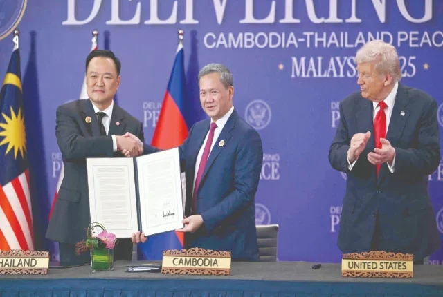 امریکی صدر ڈونلڈ ٹرمپ نے کمبوڈیا کے وزیر اعظم ہن مانیٹ (سی) اور تھائی لینڈ کے وزیر اعظم انوٹین چارنویرکول نے جنگ بندی کے معاہدے پر رسمی دستخط کے دوران دستخط شدہ دستاویزات کی حیثیت سے اس پر غور کیا۔ تصویر: اے ایف پی