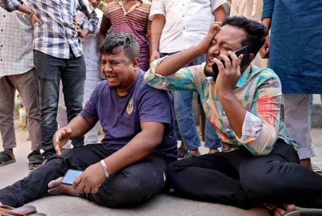 بنگلہ دیش کے ڈھاکہ میں زلزلے کے بعد مرد اسپتال کی مارگ کے باہر اپنے رشتہ داروں کی موت پر ماتم کرتے ہیں۔ تصویر: رائٹرز