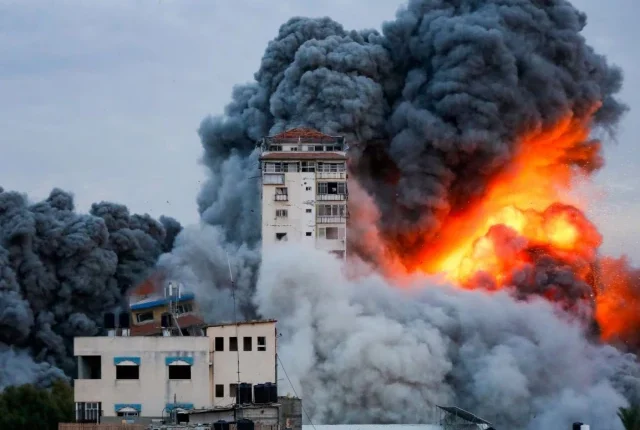 7 اکتوبر کو غزہ شہر میں اسرائیلی فوجوں نے ایک بلند و بالا ٹاور پر حملہ کرنے کے بعد دھواں اور شعلوں کے بلو کو بلو۔ تصویر: رائٹرز