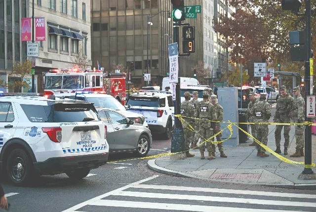 شہر واشنگٹن ڈی سی میں فائرنگ کے بعد نیشنل گارڈ کے فوجی جرائم کے منظر کے قریب جمع ہوتے ہیں۔ تصویر: اے ایف پی