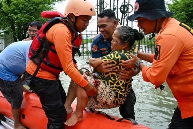 امدادی کارکنوں نے 28 نومبر ، 2025 کو شمالی سماترا کے ، میڈن ، شمالی سماترا میں سیلاب کے دوران ربڑ کی کشتی کا استعمال کرتے ہوئے ایک بزرگ کو خالی کردیا۔