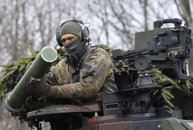 ایک سپاہی ایک مرڈر ٹینک پر میلز کا فوجی نظام نصب کرتا ہے کیونکہ بکتر بند انفنٹری بریگیڈ 37 کی مرڈر فائٹنگ وہیکل کمپنی ، جنوری 12 ، 2023 کو جرمنی کے شہر مارین برگ میں نیٹو کی اعلی تدابیر ٹاسک فورس میں حصہ لیتی ہے۔