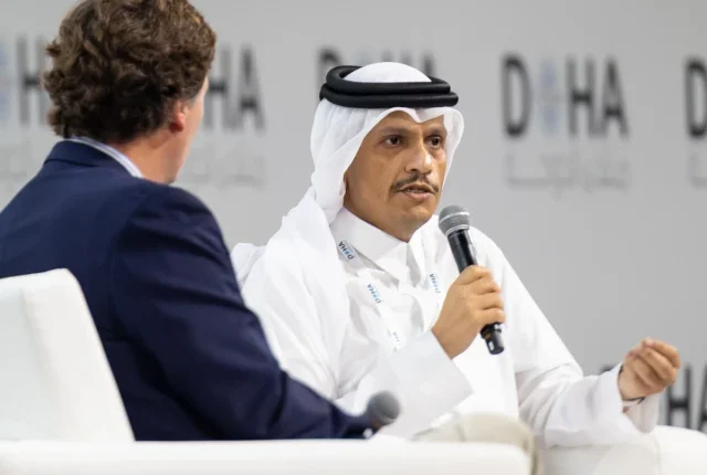 قطری کے وزیر اعظم اور وزیر خارجہ شیخ محمد بن عبد الرحمن بن جسسم ال تھانہی نے امریکی صحافی ٹکر کارلسن کے اعتدال پسند اجلاس کے دوران دوحہ فورم کے 23 ویں ایڈیشن میں خطاب کیا۔ تصویر: x