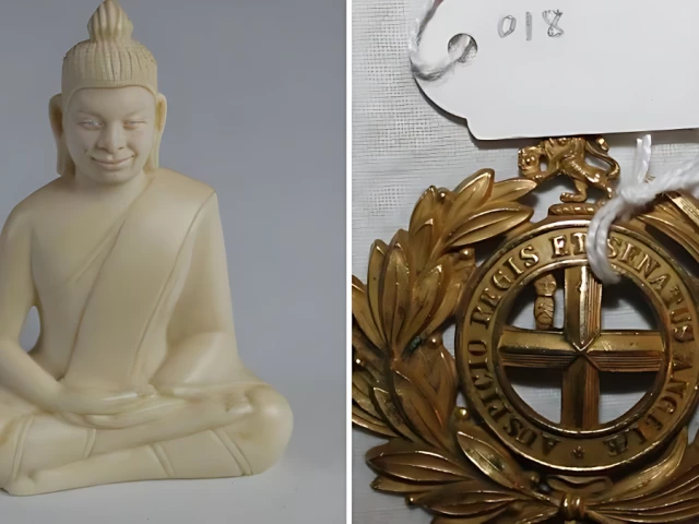 لی گئی اشیا میں ہاتھی دانت بدھ (بائیں) اور ایسٹ انڈیا کمپنی (دائیں) کے افسر سے تعلق رکھنے والی کمر کی پلیٹ شامل ہے۔ تصویر: ایون اور سومرسیٹ پولیس