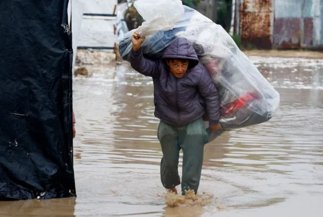 12 دسمبر ، 2025 کو وسطی غزہ کی پٹی ، نوسیرات میں بارش کے دن سیلاب زدہ خیمے کے کیمپ میں ایک بے گھر ہونے والا فلسطینی سامان لے کر جاتا ہے۔ تصویر: رائٹرز