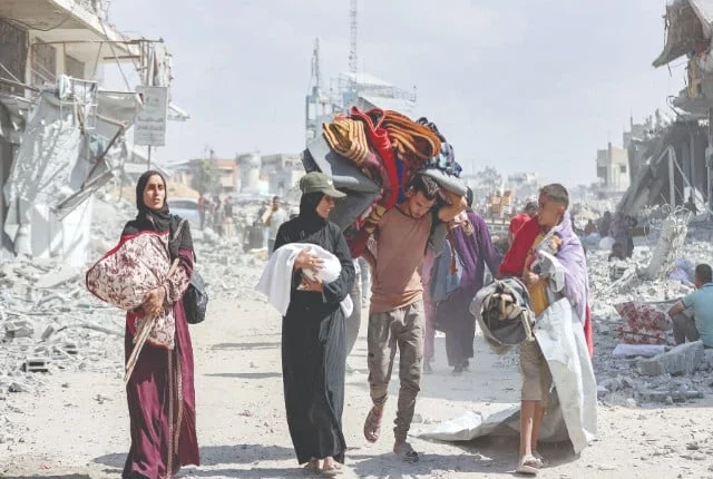 ایک بچہ لے جانے والی ایک عورت دوسرے لڑکے کے ساتھ بات کرتی ہے جب وہ جنوبی غزہ کی پٹی میں خان یونس کے وسط میں تباہ شدہ عمارتوں کے ملبے کے ملبے کے ساتھ دوسرے لوگوں کے ساتھ چلتی ہے۔ تصویر: اے ایف پی