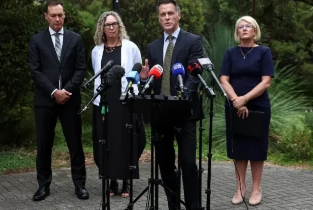 نیو ساؤتھ ویلز کے پریمیئر کرس منز نے بونڈی بیچ پر مہلک فائرنگ کے بارے میں ایک پریس کانفرنس کے دوران خطاب کیا ، وزیر برائے پولیس اور انسداد دہشت گردی یاسمین کیٹلی کے ساتھ ، اور آسٹریلیائی گن سیفٹی الائنس (اے جی ایس اے) کے کنوینر اسٹیفن بینڈل ، این ایس ڈبلیو پارلیمنٹ میں ، سڈنی ، آسٹریلیا ، 22 دسمبر میں۔