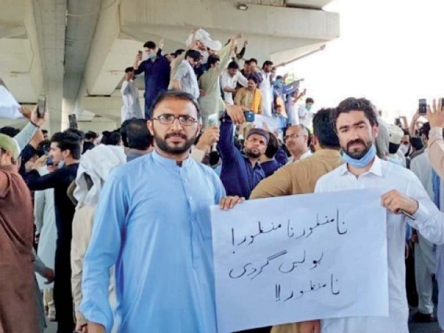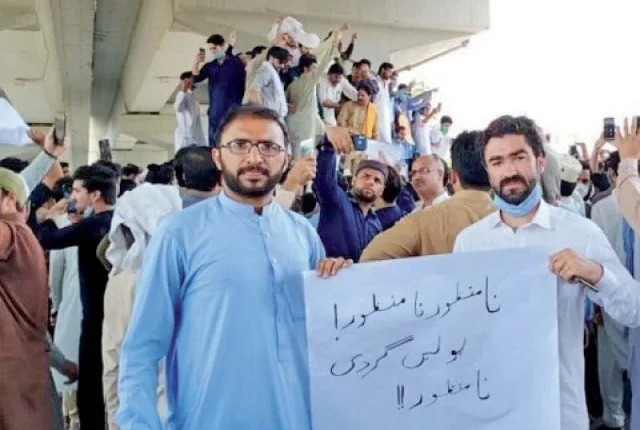 پشاور میں ایک مظاہرے میں مظاہرین کے ذریعہ دکھائے جانے والے ایک پلے کارڈ میں لکھا گیا ہے کہ "پولیس کے ذریعہ اقتدار کا غلط استعمال قابل قبول نہیں ہے۔” تصویر: ایکسپریس