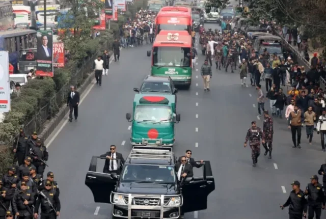 سیکیورٹی فورسز نے بنگلہ دیش کی سابقہ ​​وزیر اعظم خالدہ ضیا کی لاش لے جانے والی ایک گاڑی کو 31 دسمبر ، 2025 کو ڈھاکہ میں اپنے آخری رسومات کے لئے ایک قافلے میں لے جانے والی گاڑی کی تخرکشک کی تصویر: رائٹرز