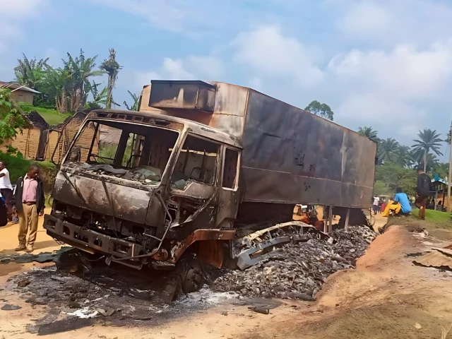 فائل: اسلامک اسٹیٹ سے وابستہ الائیڈ ڈیموکریٹک فورسز (اے ڈی ایف) باغیوں کے حملے کے بعد جلا دیئے جانے کے بعد ٹرک کا ایک چارڈ ملبص اس سڑک پر کھڑا ہے۔