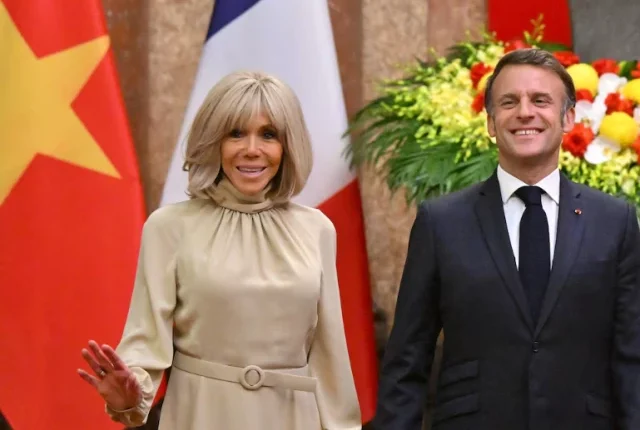 فرانس کے صدر ایمانوئل میکرون اور ان کی اہلیہ بریگزٹ میکرون نے 26 مئی ، 2025 کو ہنوئی کے صدارتی محل میں ایک میٹنگ کے دوران فوٹو کے لئے پیش کرتے ہوئے اس کا رد عمل ظاہر کیا۔ تصویر: رائٹرز