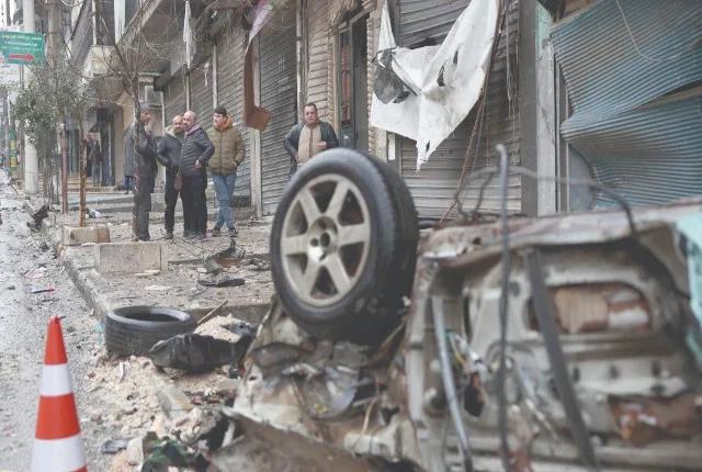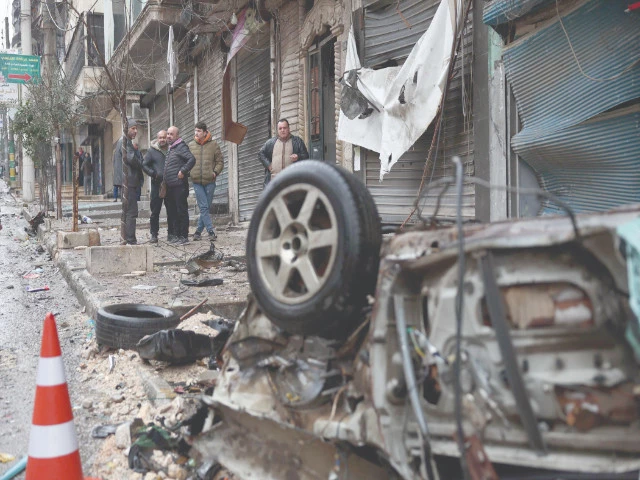 حلب کے کرد اکثریتی اشرفیئہ محلے میں جنگ بندی کے بعد مرد ایک تباہ شدہ گاڑی کی طرف چلتے ہیں۔ تصویر: اے ایف پی