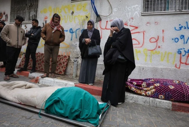 سوگواران لاشوں کے ساتھ ہی جمع ہوتے ہیں جب وہ فلسطینیوں کے جنازے میں شریک ہوتے ہیں ، جو طبیبوں کے مطابق ، 13 جنوری ، 2026 کو غزہ شہر کے الشفا اسپتال میں ، ایک تیز ہوا کے دن ، ایک جنگ سے متاثرہ عمارت میں دیوار گرنے کے بعد ہلاک ہوگئے تھے۔ تصویر: رائٹرز: رائٹرز