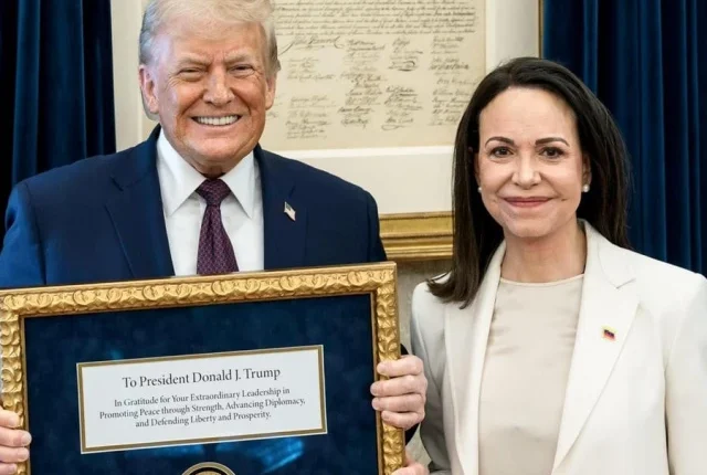 ماریا کورینا ماچاڈو نے ڈونلڈ ٹرمپ کو اپنے نوبل امن انعام کا تمغہ پیش کیا۔ تصویر: رائٹرز