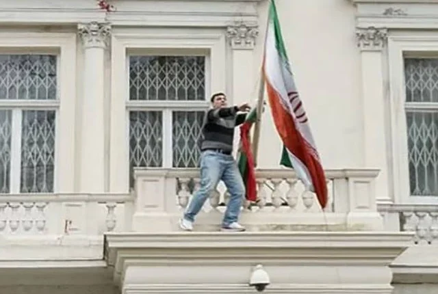 ایک مظاہرین جو لندن میں ایران کے سفارت خانے میں ایک چھت پر متعدد بالکونیوں کے پار چڑھ گیا اور ہفتے کے روز ایک جھنڈا ہٹا دیا گیا کیونکہ پولیس نے بتایا کہ انہوں نے 13 دیگر افراد کو بھی گرفتار کیا ہے۔