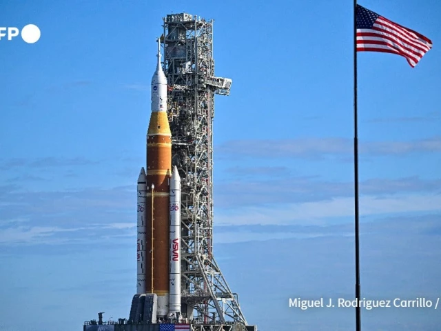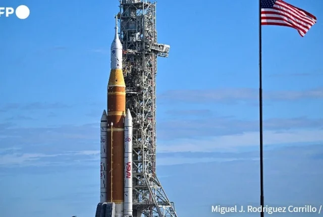 ناسا نے ہفتے کے روز اپنا زبردست ایس ایل ایس راکٹ اور اورین خلائی جہاز تیار کیا۔ تصویر: اے ایف پی