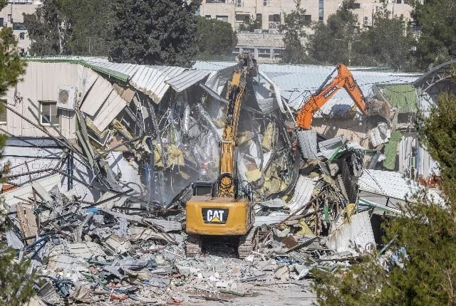 اے ایف پی کی تصاویر میں کمپاؤنڈ میں بھاری مشینری کو مسمار کرنے والے ڈھانچے دکھائے گئے ، جیسے ہی اسرائیلی پرچم اوور ہیڈ پھڑپھڑ گیا۔