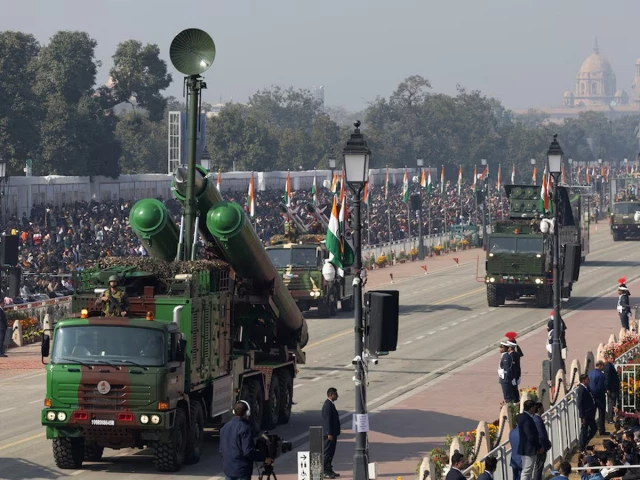 انڈیا آرمی کا برہموس میزائل لانچر 26 جنوری کو نئی دہلی ، ہندوستان میں جمہوریہ کے جمہوریہ پریڈ کے دوران دکھایا گیا ہے۔ تصویر: رائٹرز