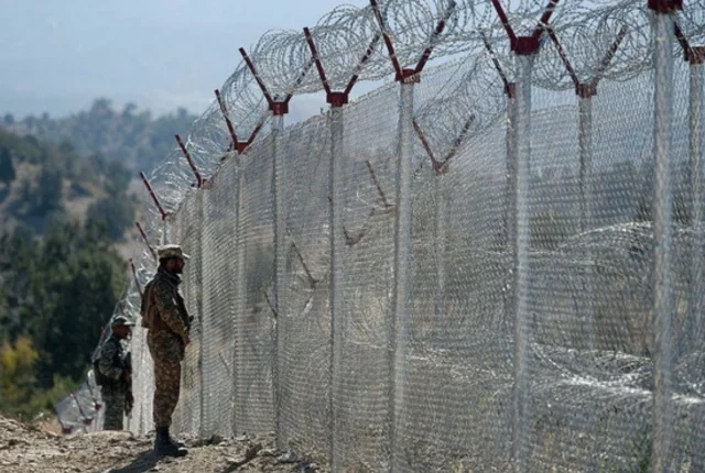 پاکستانی فوجی جنوبی وزیرستان میں انگور اڈا میں افغان کے صوبہ پاکٹیکا سرحد کے ساتھ ساتھ نئی باڑ والی سرحد کی باڑ لگانے کے ساتھ نگرانی کرتے ہیں۔ تصویر: اے ایف پی