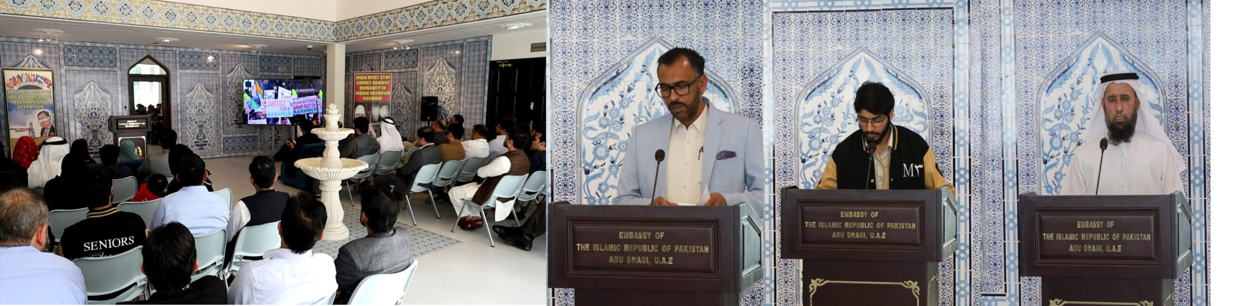متحدہ عرب امارات میں پاکستان کے سفیر شفقت علی خان کی جانب سے سفارت خانے کی منسٹر/ڈپٹی ہیڈ آف مشن محترمہ فوزیہ فیاض احمد نے ایک مختصرخطاب میں ہندوستان کے مقبوضہ جموں و کشمیرپرناجائزتسلط کے خلاف مقبوضہ جموں وکشمیر کے بہادر لوگوں کو زبردست خراج تحسین پیش کیا اور حق خود ارادیت کے لیے ان کی طویل جدوجہد کی ستائش کی۔مقبوضہ جموں وکشمیر میں بھارت کے یکطرفہ اور غیر قانونی اقدامات کی مذمت کرتے ہوئے، انہوں نے کہا کہ بھارت کے مظالم کشمیریوں کو اقوام متحدہ کے مطابق اپنے بنیادی حقوق کا مطالبہ کرنے سے نہیں روک سکتے۔