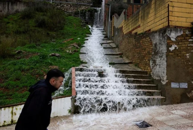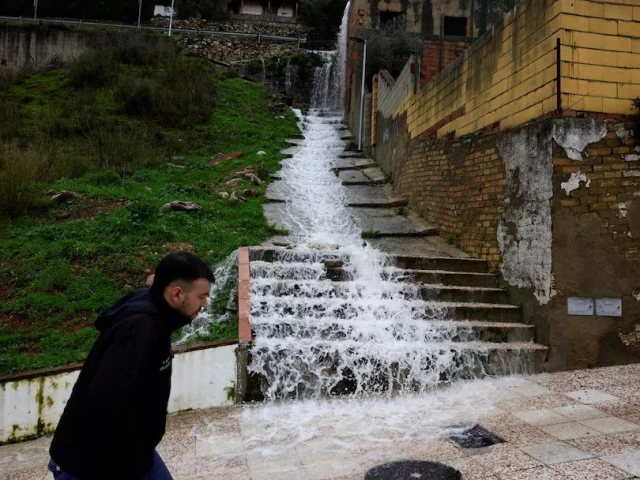 تیز بارش کی وجہ سے ایک شخص ایک گلی میں سیڑھیوں سے نیچے بہتا ہے ، جب طوفان لیونارڈو اسپین کے کچھ حصوں سے ، اسپین کے ، اسپین کے کچھ حصوں سے ٹکرا رہا ہے۔