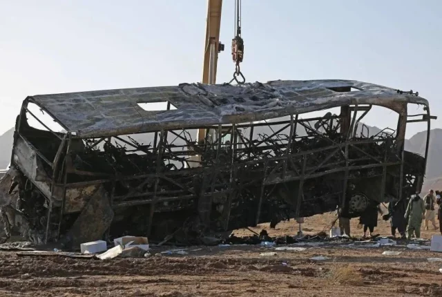 20 اگست ، 2025 کو صوبہ ہرات کے ضلع گوزارا میں حادثے کے مقام پر بس کا ملبہ بند کردیا گیا ہے۔ فائل فوٹو: اے ایف پی