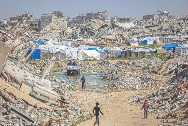 لڑکے شمالی غزہ کی پٹی میں فلسطینی مہاجرین کے لئے جبلیہ کیمپ میں تباہ شدہ عمارتوں کے ملبے سے گذرتے ہیں۔ تصویر: اے ایف پی