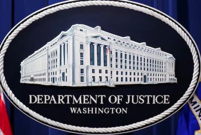 امریکی محکمہ انصاف کا ایک لوگو یا مہر جس میں محکمہ انصاف کے ہیڈ کوارٹرز کو دکھایا جاتا ہے ، جسے "مین جسٹس” کے نام سے جانا جاتا ہے ، واشنگٹن ، 24 جنوری ، 2023 میں واشنگٹن میں محکمہ کے ہیڈ کوارٹر بریفنگ روم میں پوڈیم کے پیچھے دیکھا جاتا ہے۔ تصویر: رائٹرز