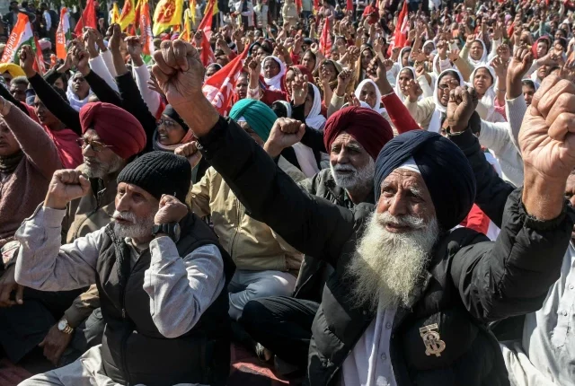 کسانوں اور تجارتی یونین کے کارکنان 12 فروری ، 2026 کو امرتسر میں سرکاری پالیسیوں اور دیگر امور پر ملک گیر ہڑتال کے دوران نعرے لگاتے ہیں۔