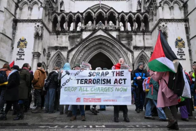 لندن، برطانیہ، 13 فروری، 2026 میں، لوگ ہائی کورٹ کے باہر احتجاج کر رہے ہیں جب جج برطانوی حکومت کے فلسطینی حامی گروپ فلسطین ایکشن کو دہشت گرد تنظیم قرار دینے کے فیصلے کے خلاف قانونی چیلنج پر فیصلہ دینے کی تیاری کر رہے ہیں۔ تصویر: REUTERS