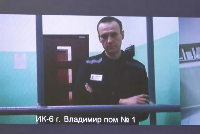 ماسکو، روس میں 26 ستمبر 2023 کو ایک انتہا پسند تنظیم کی تشکیل سمیت متعدد الزامات پر مجرمانہ مقدمے میں اپنی سزا کے خلاف اپیل پر غور کرنے کے لیے ایک عدالتی سماعت کے دوران روسی اپوزیشن کے سیاست دان الیکسی ناوالنی ولادیمیر کے علاقے میں IK-6 پینل کالونی سے ویڈیو لنک کے ذریعے ایک اسکرین پر دکھائی دے رہے ہیں۔ تصویر: REUS