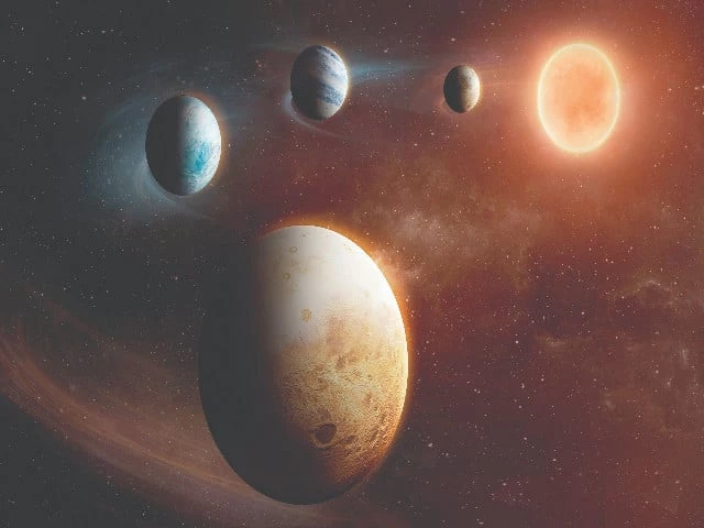 ایک چھوٹے سے سرخ ستارے کے ارد گرد چار سیاروں پر مشتمل سیاروں کے نظام کا ایک فنکار کا تاثر، جسے LHS1903 کہا جاتا ہے، جس میں سرخی مائل بھورے چٹانی سیارے کے ساتھ گڑھے ہیں، پیش منظر میں اور تین چھوٹے سیارے دکھائی دیتے ہیں۔ تصویر: رائٹرز